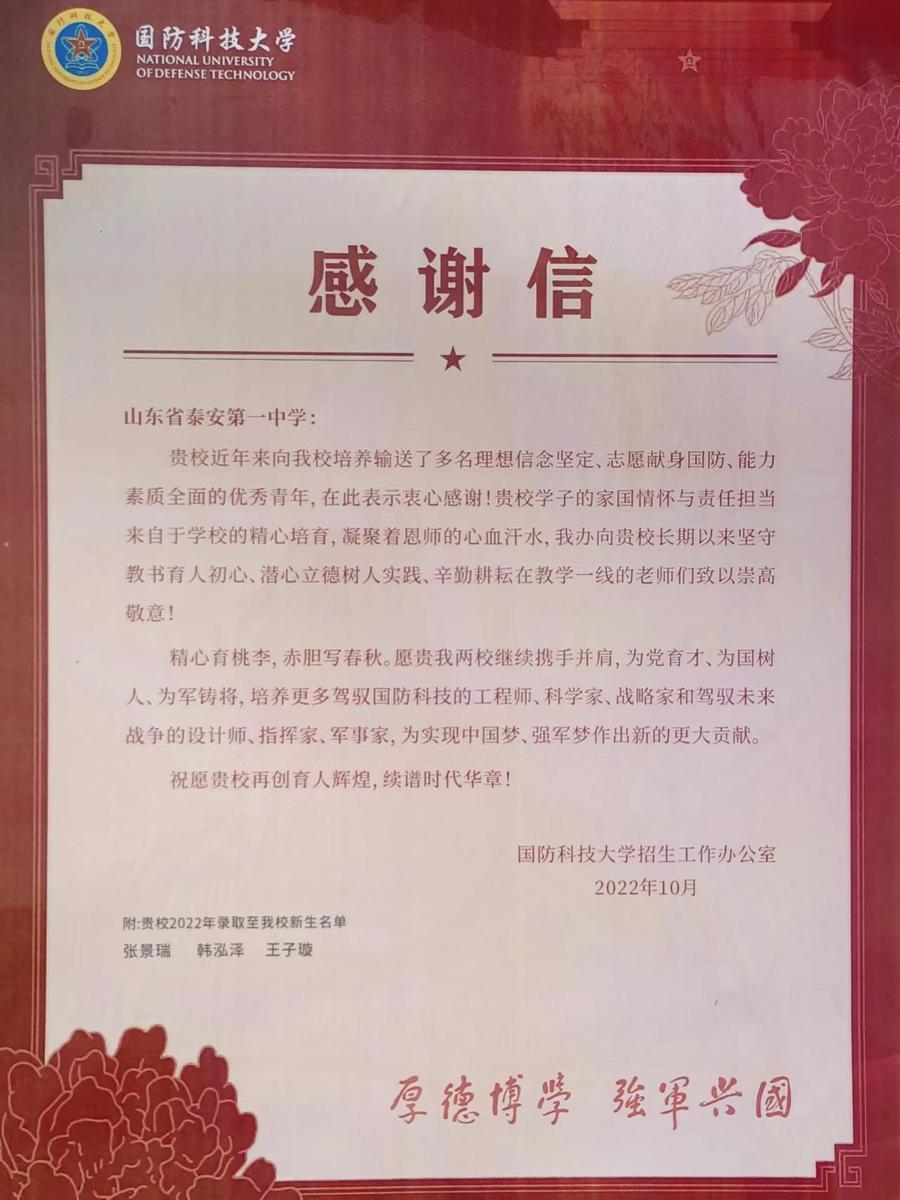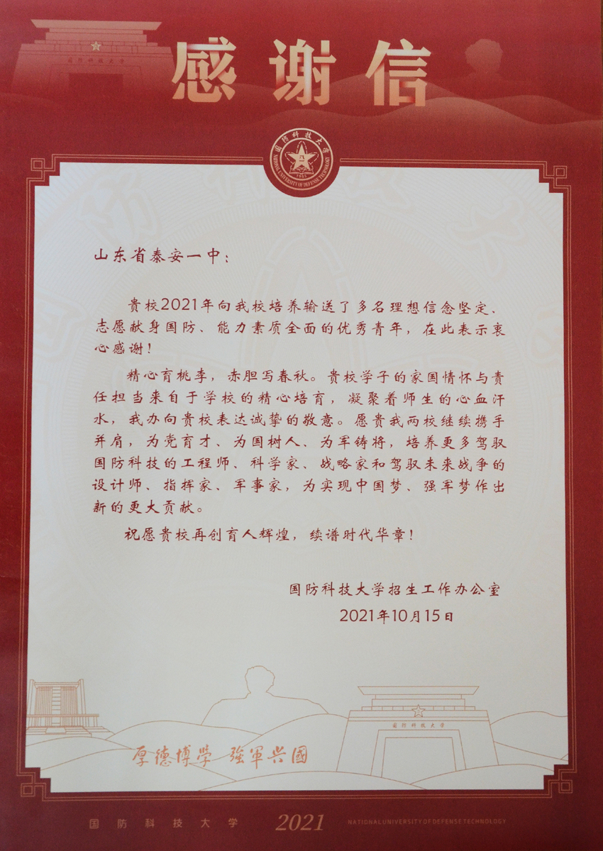 国防科技大学感谢信