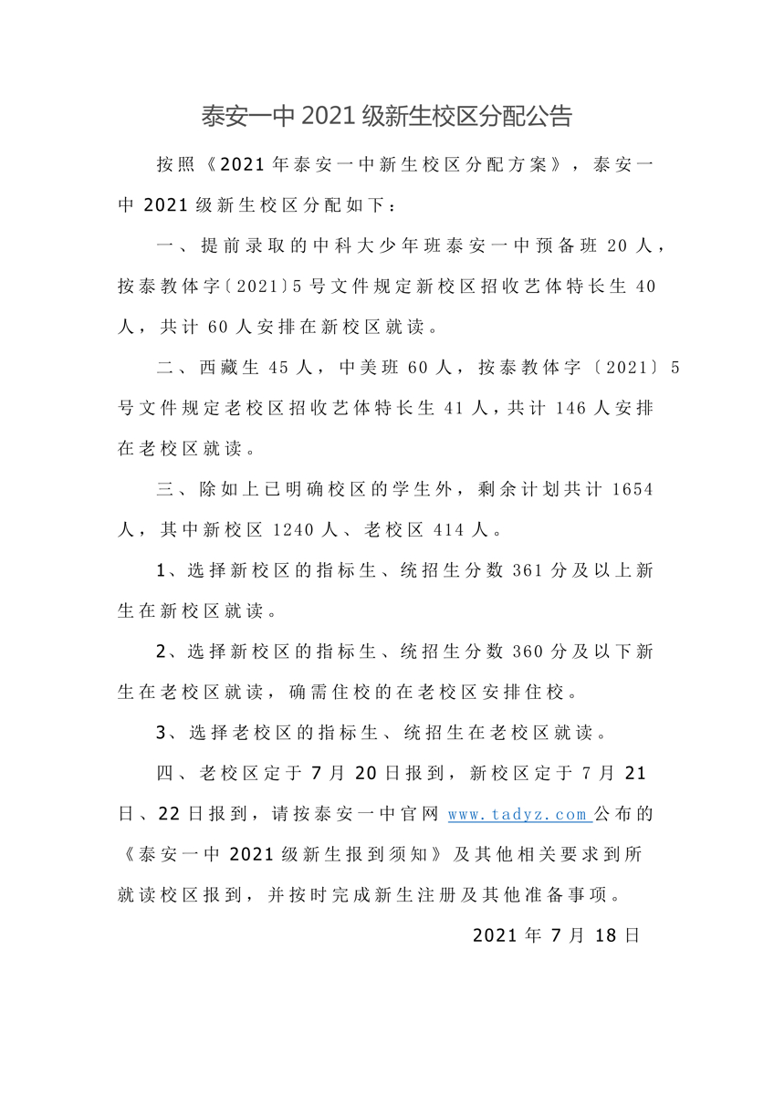 泰安一中2021级新生校区分配公告
