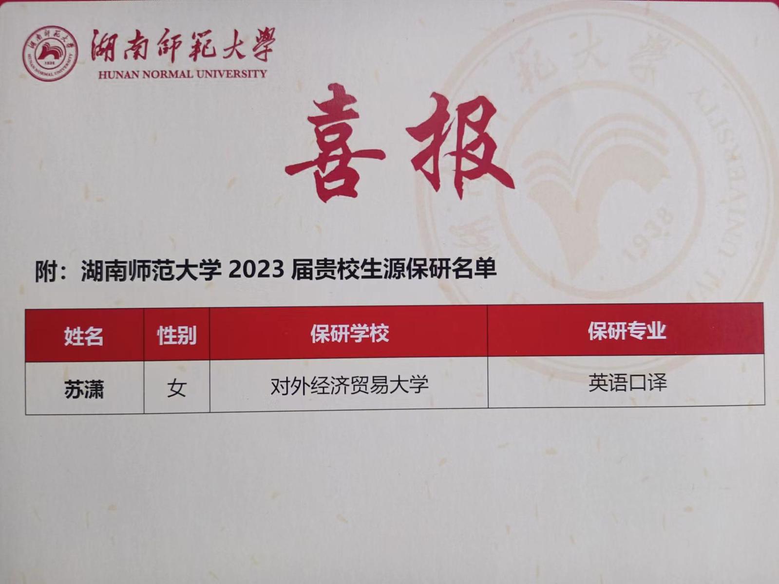 湖南师范大学喜报