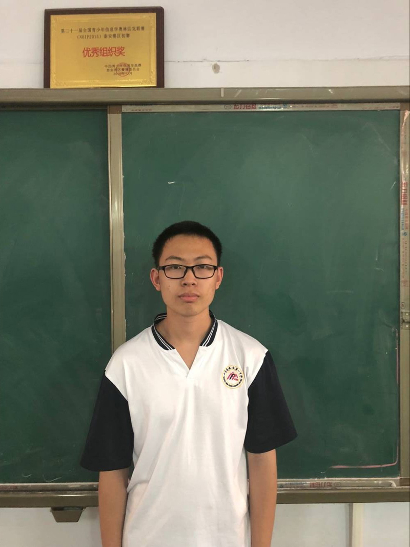 2016级9班,罗天宇。自进入泰安一中以来,在学校的帮助和老师的精心指导下,根据自己的兴趣爱好,认真学习信息学知识,积极参加各类培训和比赛。在NOIP2017获得省级一等奖,参加APIO2018并获得了一定的成绩。今后,我会更加全面的学习,争取更好的成绩。