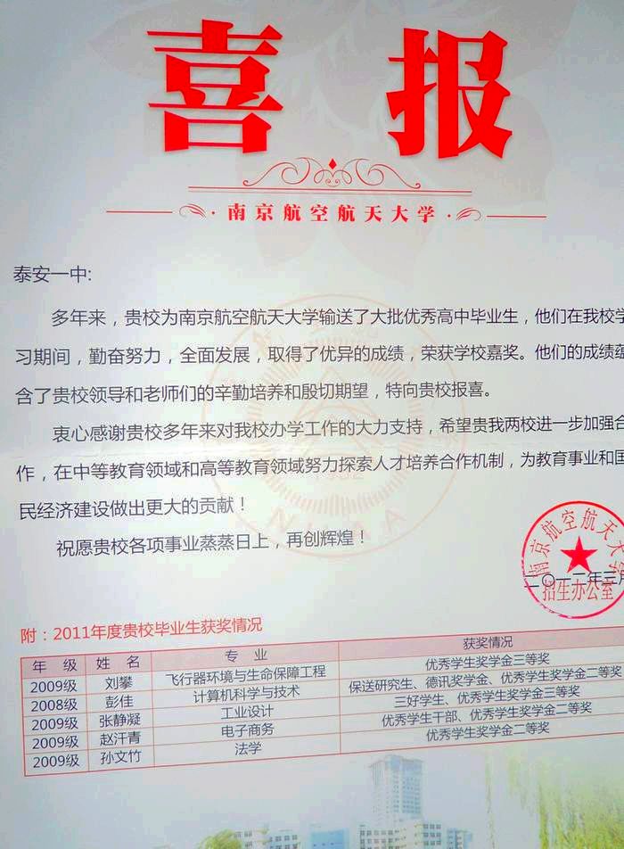 南京航空航天大学致我校喜报