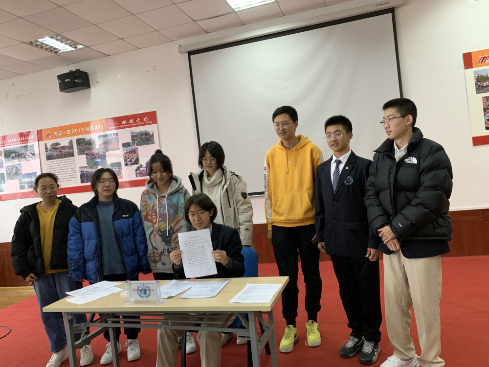 按照泰安一中国际部的课程和活动安排,经过数次观看联合国大会的实况视频和排练,11月23日上午,2019级中美班模拟联合国社团举行了第一次实战模联活动。 在国际部老师们的悉心指导和严格培训下,2019级全体同学查阅和背诵了大量的专业词汇和表达,精心准备、认真研读和分析模联的各个环节和注意事项,各个国家的模拟代表团按照相应国家的立场查阅大量资料,详细研究和制定有效方案并形成主旨明确、立场坚定的发言稿。模联开始,在模拟联合国秘书长、联合国大会轮值主席和主席助理的统一组织下,各个代表唇枪舌剑、轮番斡旋,经过一般性辩论和实质性辩论最后形成决议草案,各代表团认真完成修正案并形成最终决议。 本次模联活动让2019级中美班每个同学都得到了锻炼和提升,特别是语言表达能力、文献研究和文件书写能力以及辩论技巧等方面收获颇丰,在接下来的两周内将举办第二次模联活动。模联社团活动是国际部的特色校本课程之一,对于中美班学生托福课程的听、说、读、写技能的培养和提高将大有裨益。(国际部) ![]() ![]()