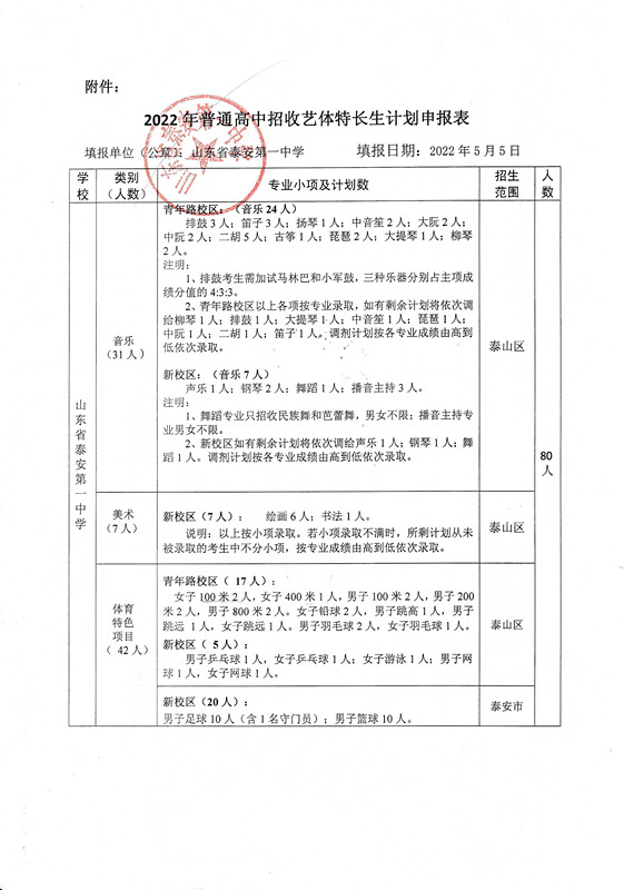 泰安一中2022年艺体特长生招生计划
